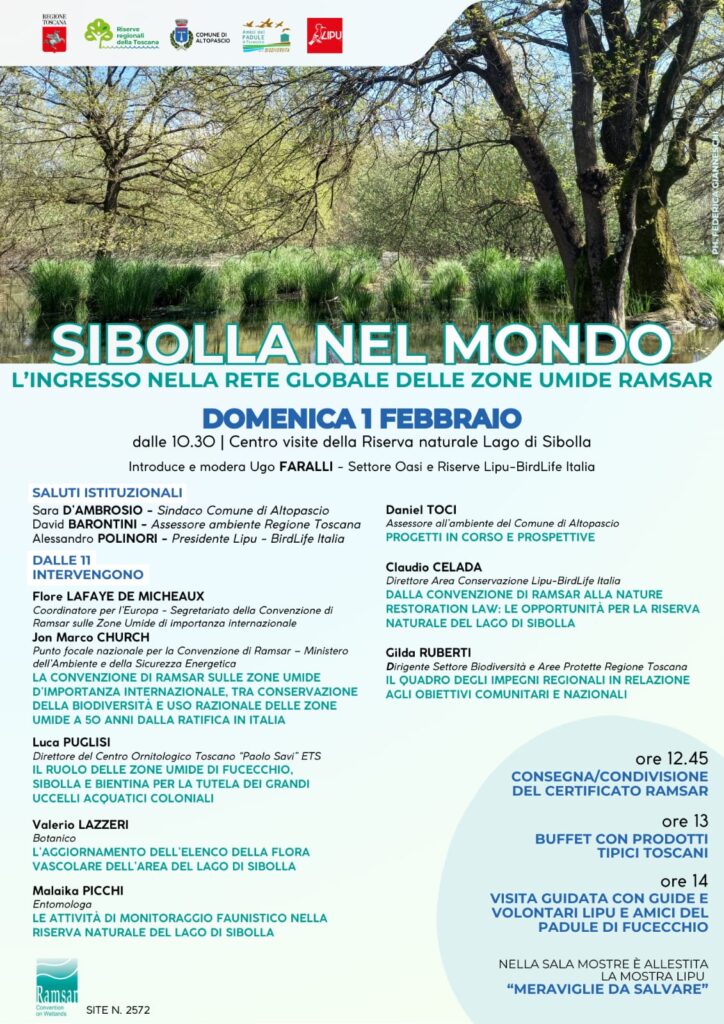 In occasione della Giornata Mondiale delle Zone Umide, domenica 1 Febbraio,  presso il Centro Visite della Riserva Naturale del Lago di Sibolla, si celebrerà l’ingresso del Lago di Sibolla nella rete delle zone umide di importanza internazionale, con la condivisione del Certificato della Convenzione di Ramsar.
